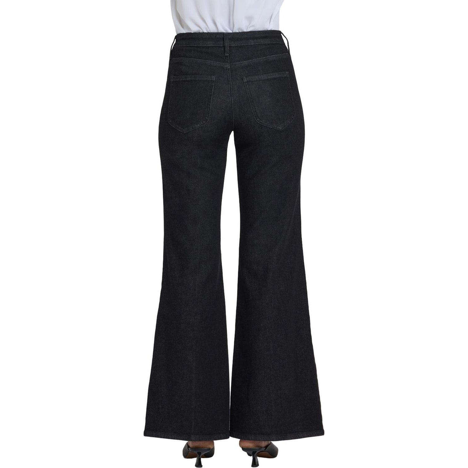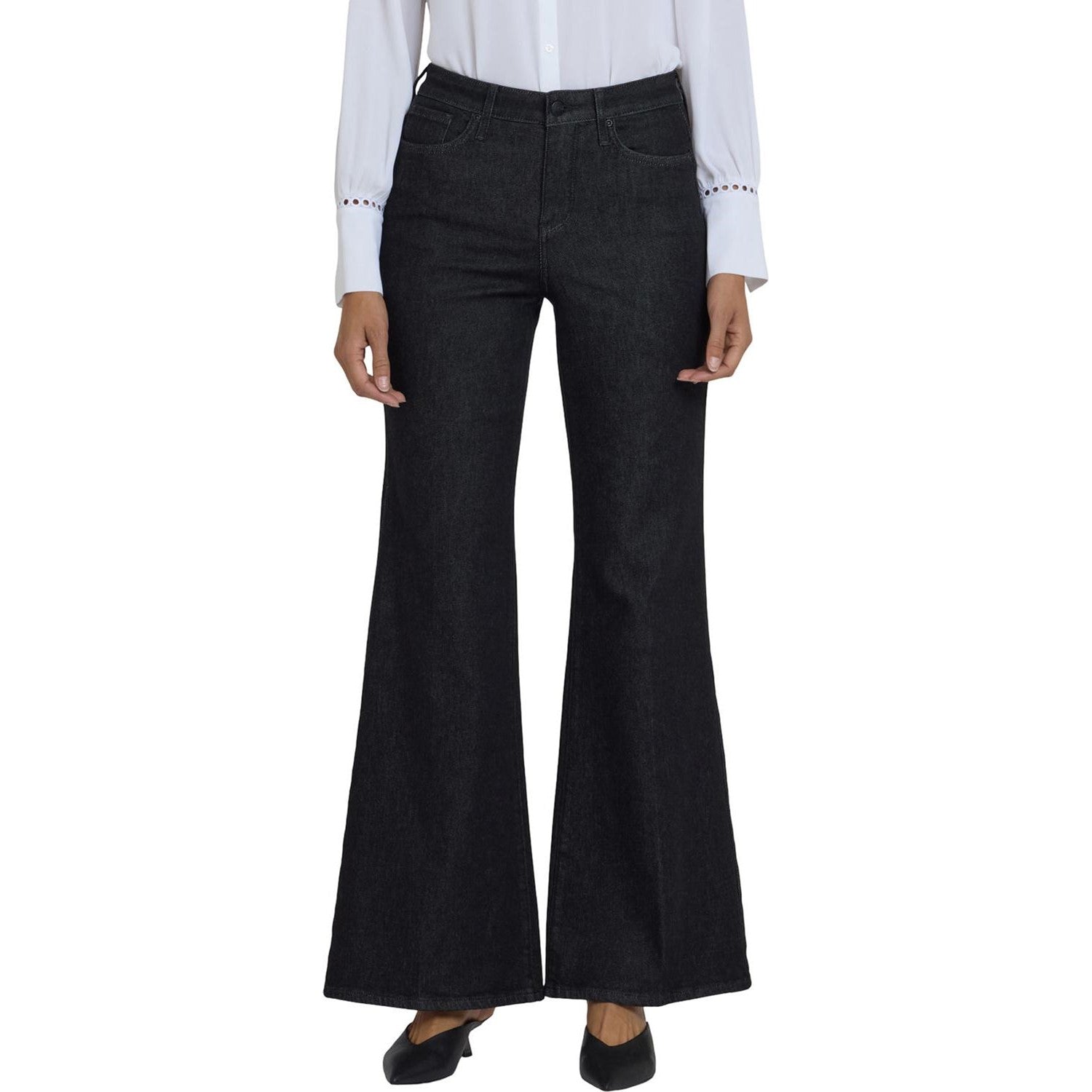 NYDJ's Mia Palazzo Jeans make a bold, breezy statement with their super-flared legs. Sitting high on the waist, this pair has a flattering fit that hugs the hips and thighs and is detailed with center-leg creases. Our Lift Tuck Technology uses a proprietary slimming panel with a patented criss-cross design to shape and support your curves for an always-sleek silhouette. Features five-pocket styling and a zip fly with button closure. This jean is made with earth-friendly methods that result in reduced consumption of water, chemicals and/or energy.