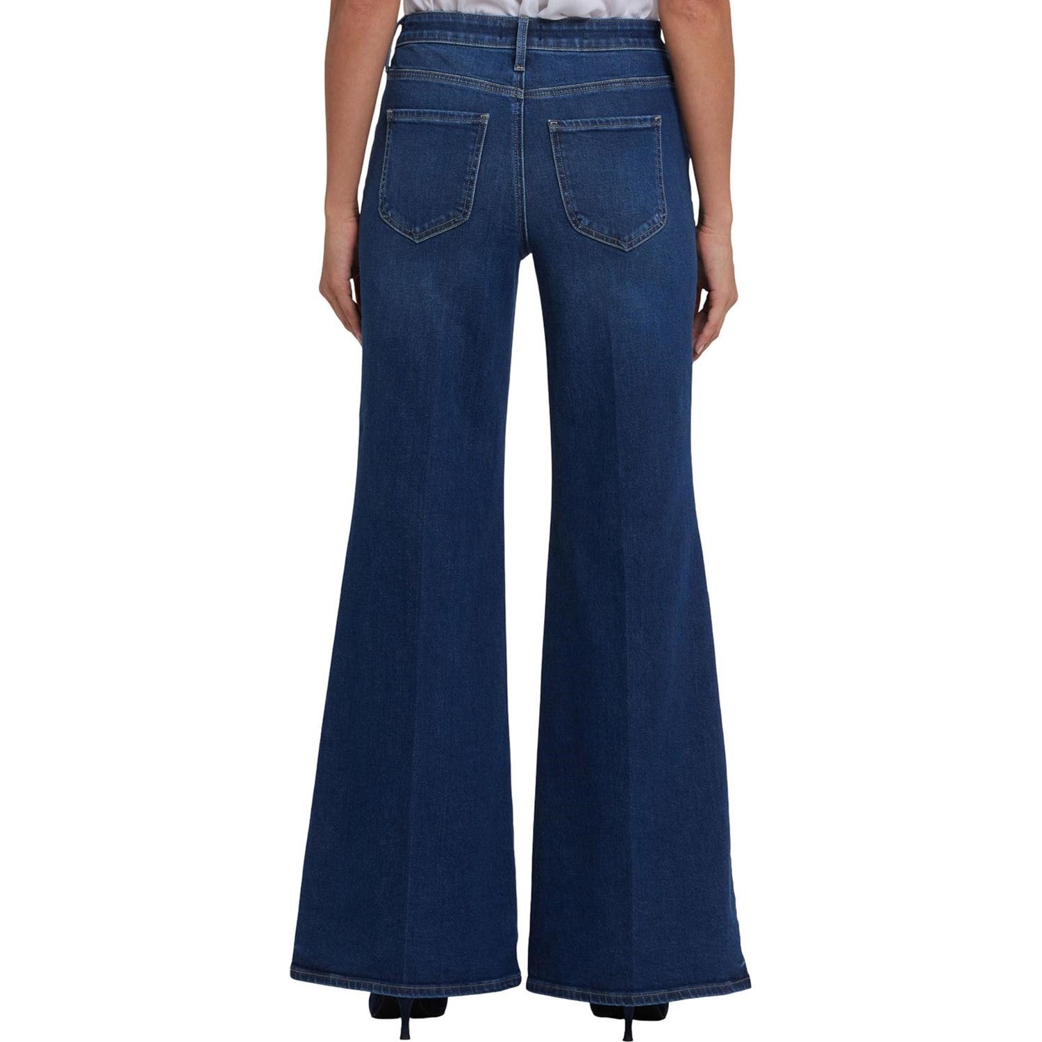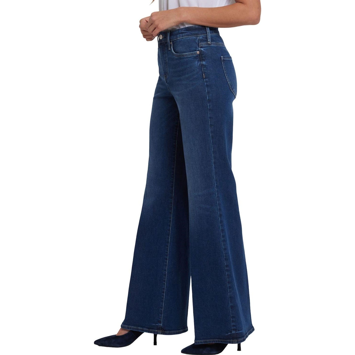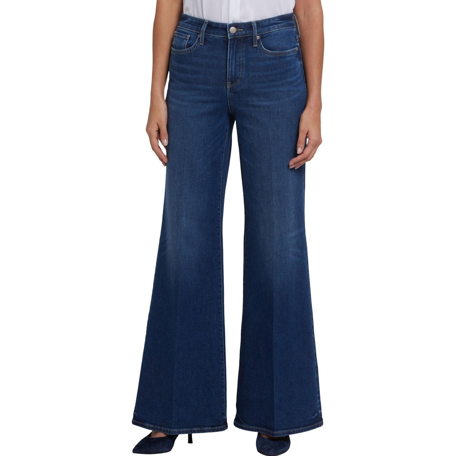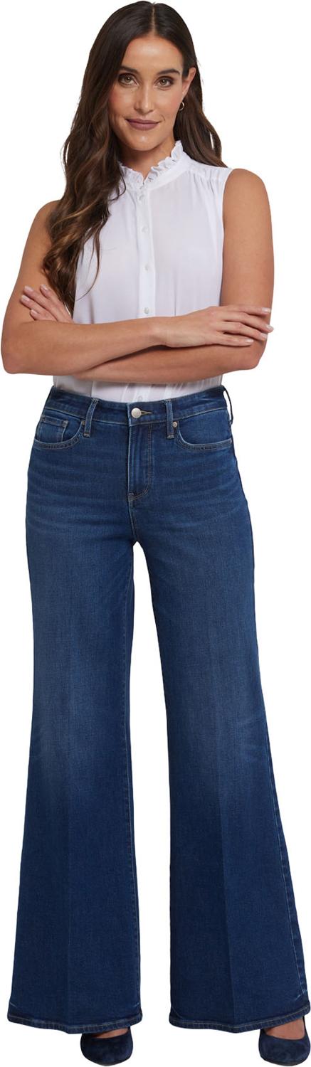 NYDJ's Mia Palazzo Jeans make a bold, breezy statement with their super-flared legs. Sitting high on the waist, this pair has a flattering fit that hugs the hips and thighs and is detailed with center-leg creases. Our Lift Tuck Technology uses a proprietary slimming panel with a patented criss-cross design to shape and support your curves for an always-sleek silhouette. Features five-pocket styling and a zip fly with button closure. Vintage Lapis is a medium indigo wash with highs and lows throughout, whiskers, sanding, inseam chevrons and distinctive hem detail. This jean is made with earth-friendly methods that result in reduced consumption of water, chemicals and/or energy.