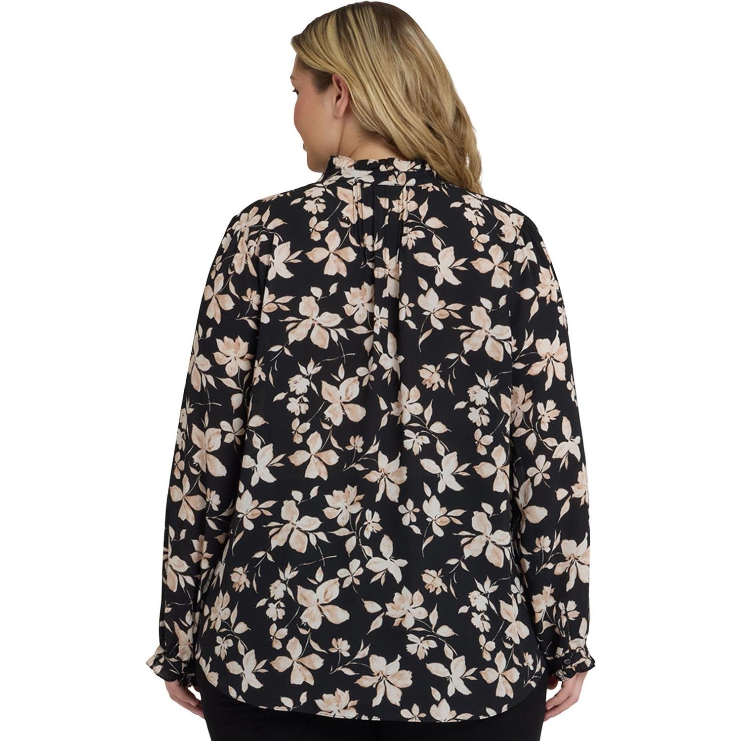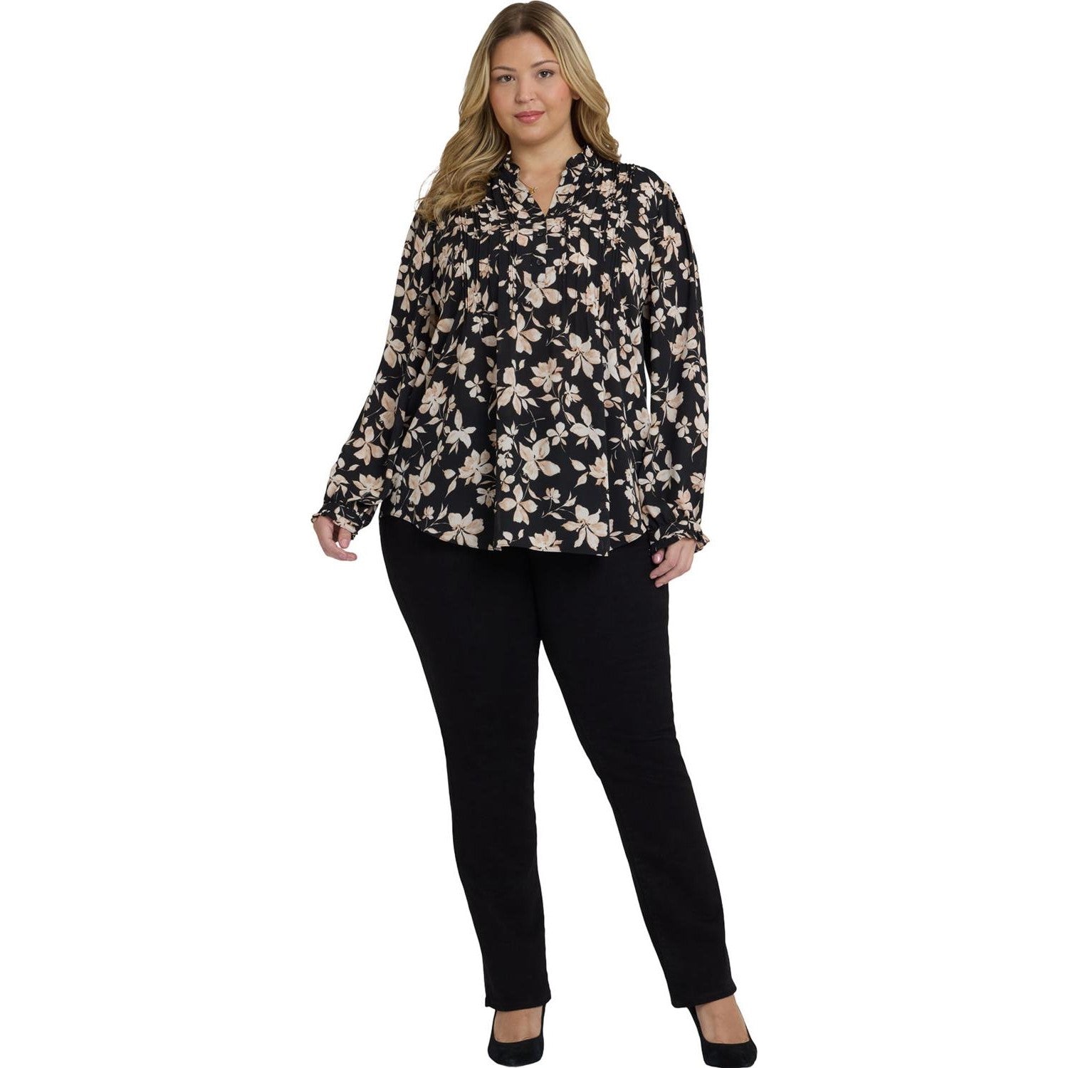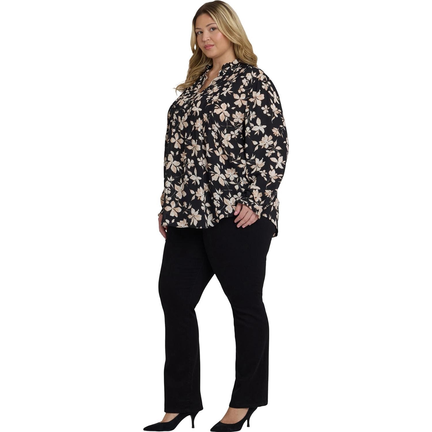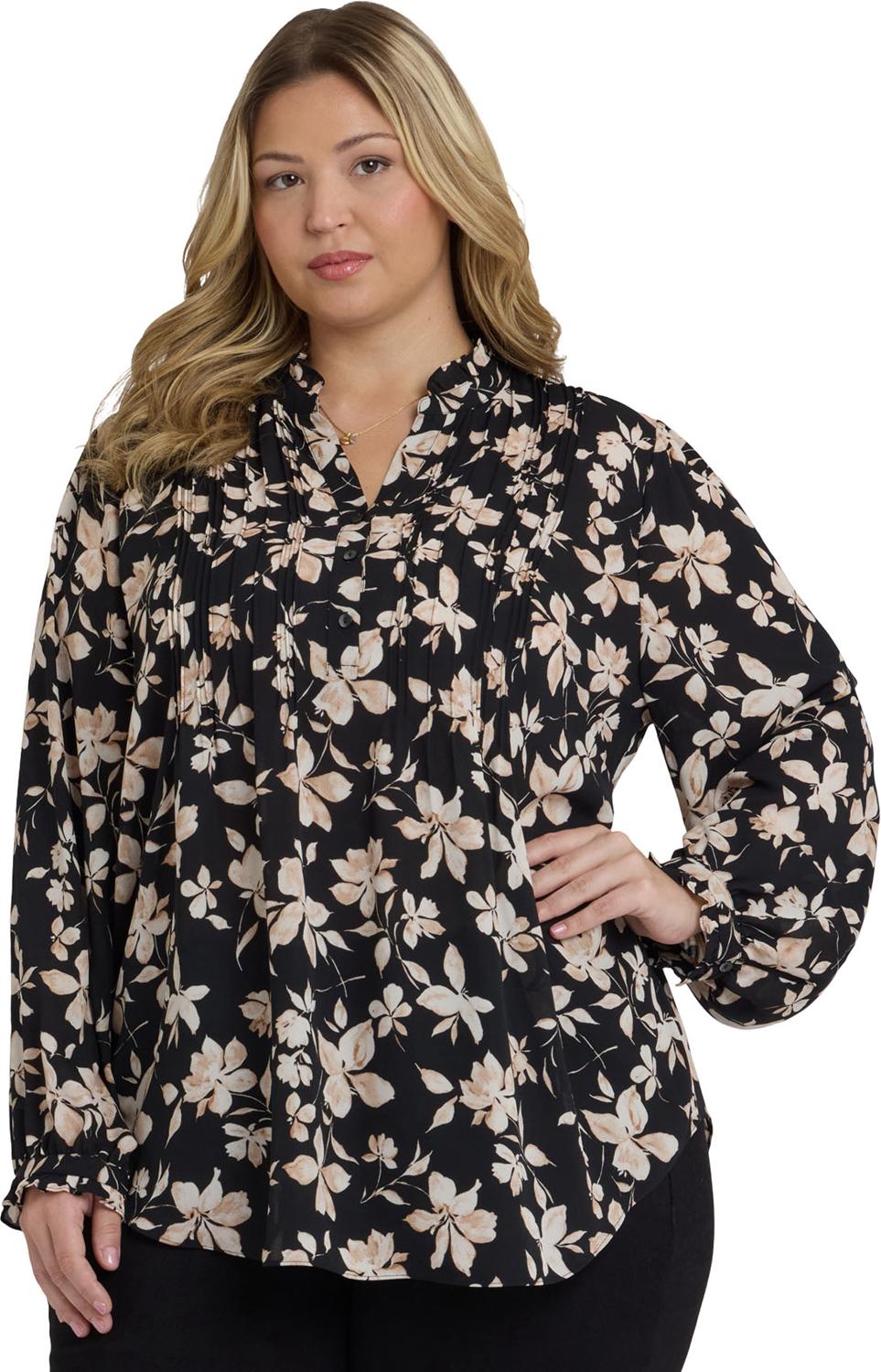 Finely crafted details lend a romantic vintage look to NYDJ's Pleated Front Tunic in Plus Size. This pullover blouse features a stand collar and long, full sleeves trimmed with ruffles, as well as front and back pleating and a front button placket. The tunic length and curved hem make this style perfect for layering over skinny jeans, slim ponte pants and leggings. This tunic's fabric is made with a sustainable polyester fiber created from 100% post-consumer plastic waste, resulting in less water and energy use and fewer greenhouse gas emissions without changing the look and feel of the fabric. The buttons are made with 50% post-consumer recycled polyester.