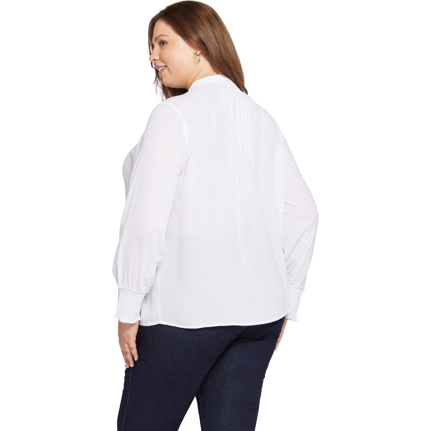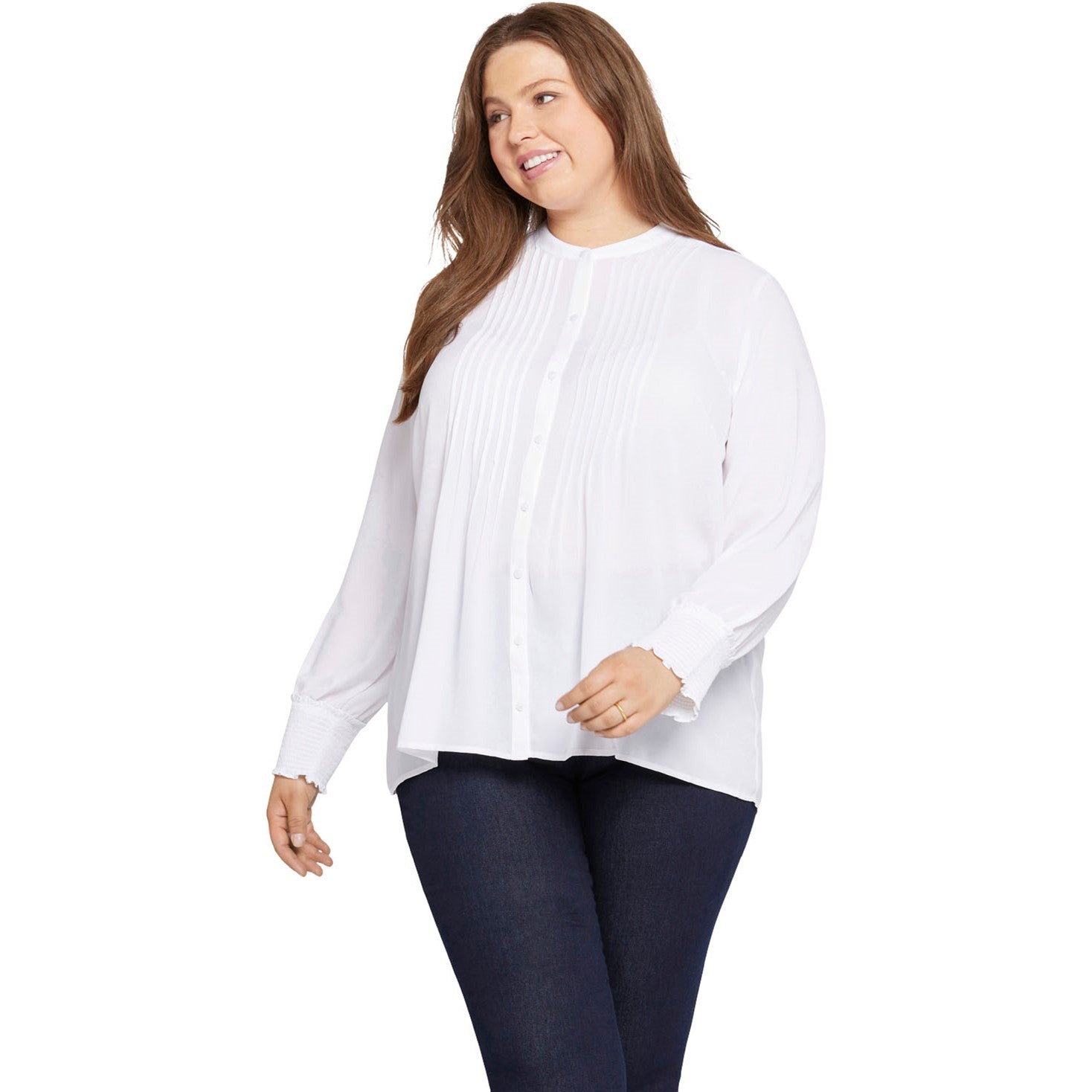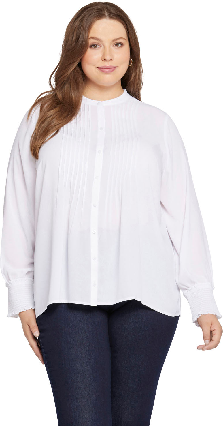 With vintage-inspired details and a soft, romantic silhouette, NYDJ's Pleated Peasant Blouse in Plus Size is perfect for dressing up your favorite denim. Front and back pleats and long, full sleeves gathered into stretch-smock cuffs give it a lovely handcrafted look. Finished with a band collar and front button closure. This blouse is made with a sustainable polyester fiber created from 100% post-consumer plastic waste, resulting in less water and energy use and fewer greenhouse gas emissions without changing the look and feel of the fabric.