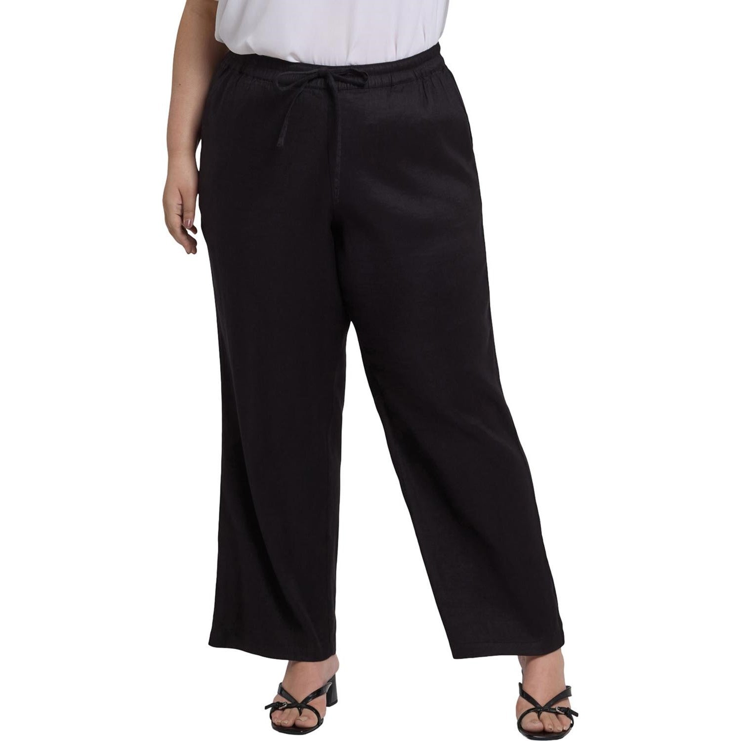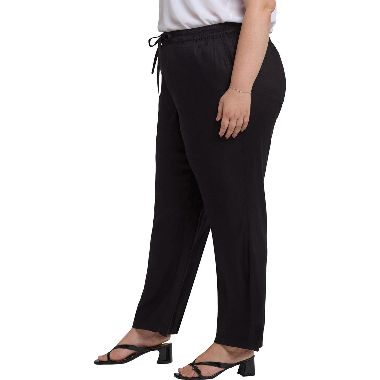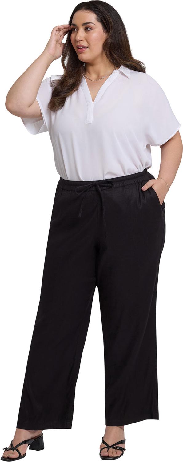 NYDJ's Relaxed Drawstring Pull-On Pants in Plus Size in Stretch Linen are an effortless, easy-to-wear wardrobe essential. Relaxed through the hip and leg with slight tapering from knee to hem, these pants feature front pockets and an adjustable stretch waist with drawstring tie.