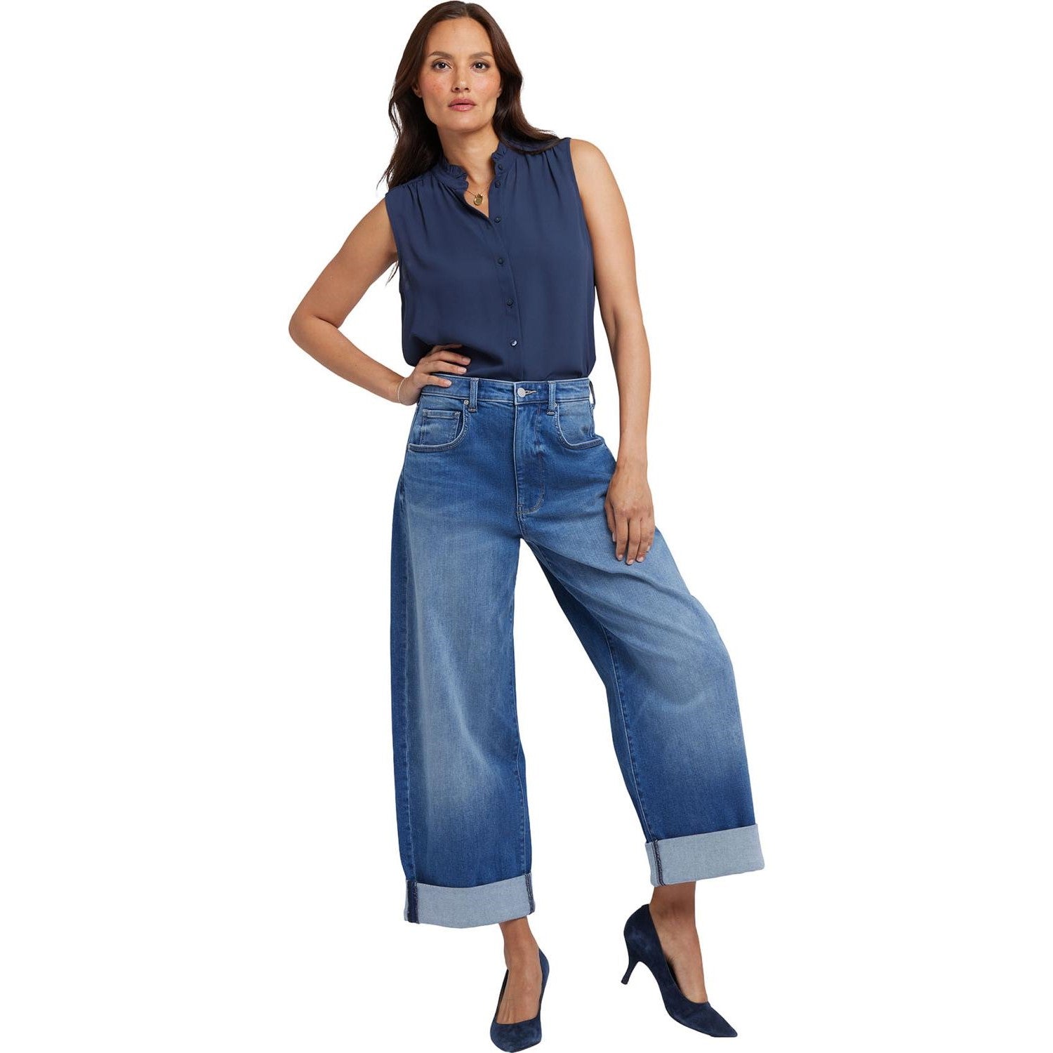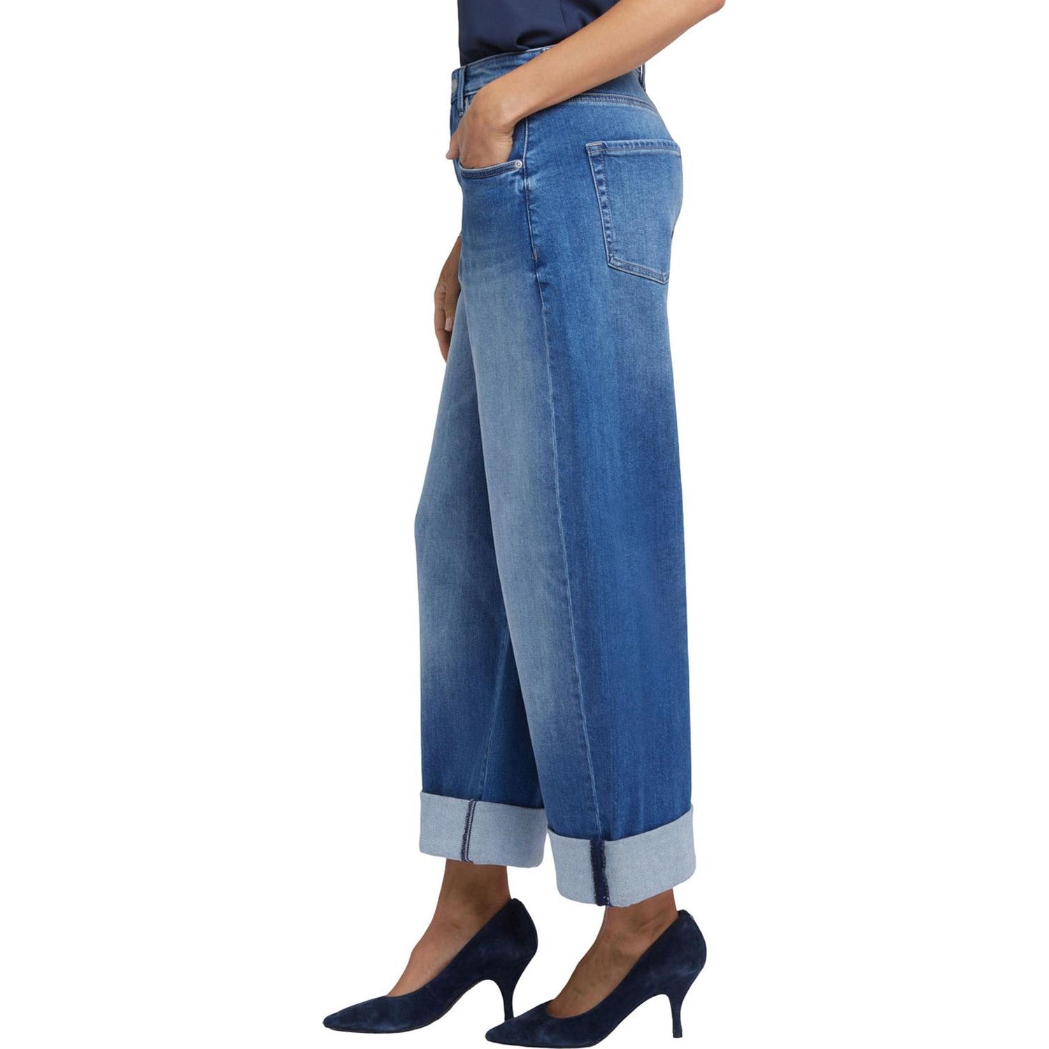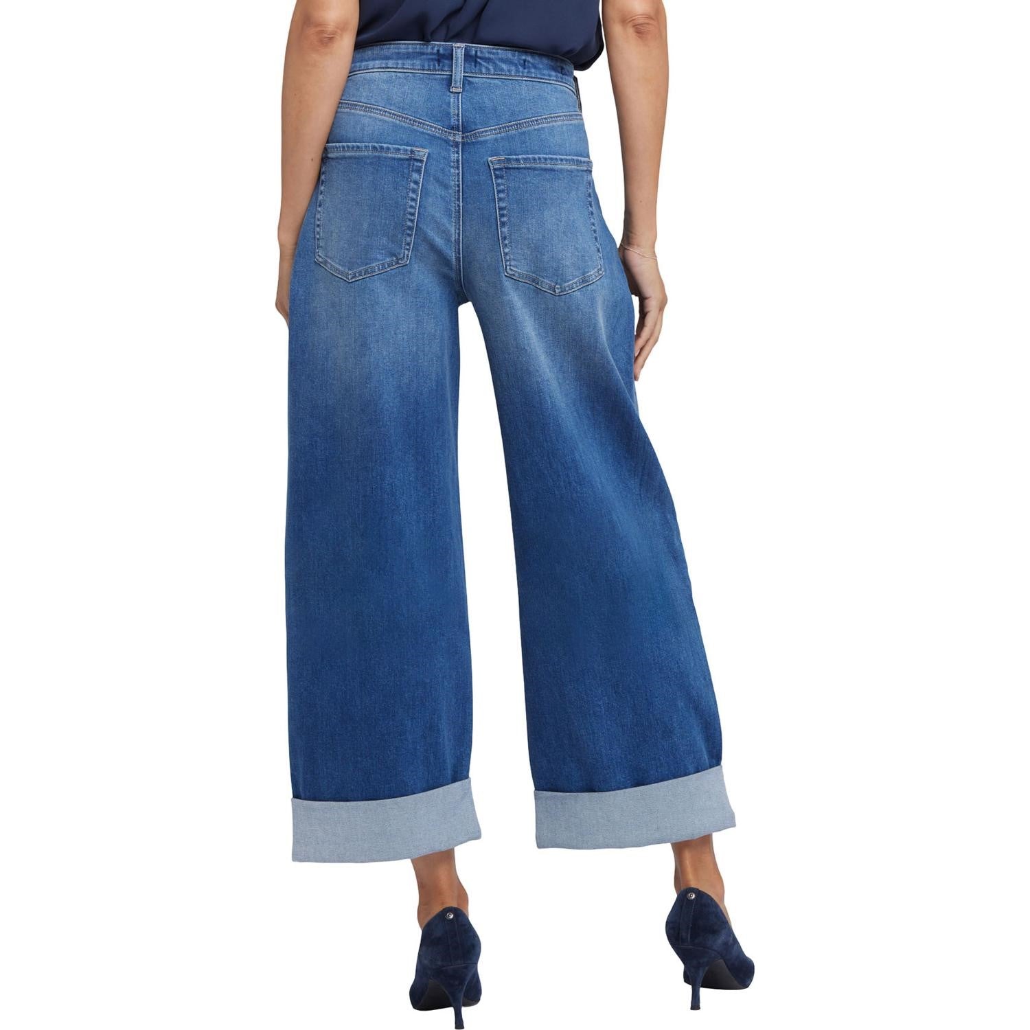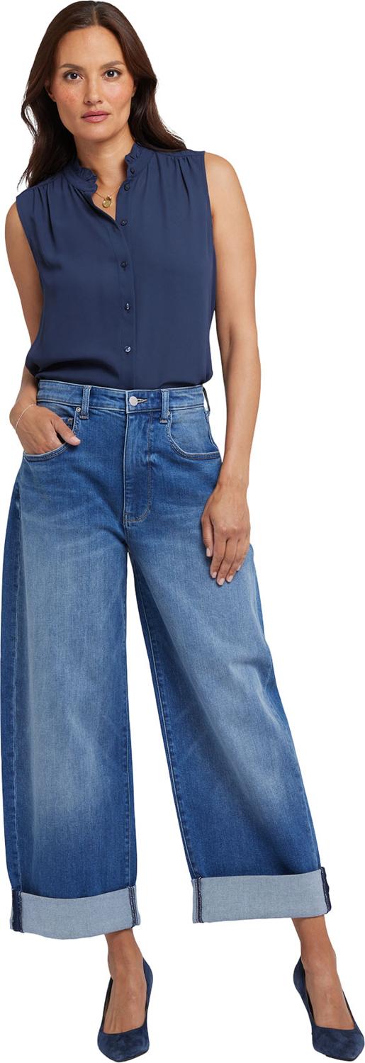 Add bold oversized style to your look with the Renee Baggy Wide Leg Jeans by NYDJ. These laid-back jeans have a super loose fit and adjustable roll cuffs. Designed to sit a little lower on the waist, they can also be worn as a high-rise silhouette pulled up to the natural waist. Finished with five-pocket styling, zip fly and button closure. Picasso Lake is a bright medium blue wash with striking whiskers, inseam chevrons, sanding and indigo highs and lows. This jean is made with earth-friendly methods that result in reduced consumption of water, chemicals and/or energy.