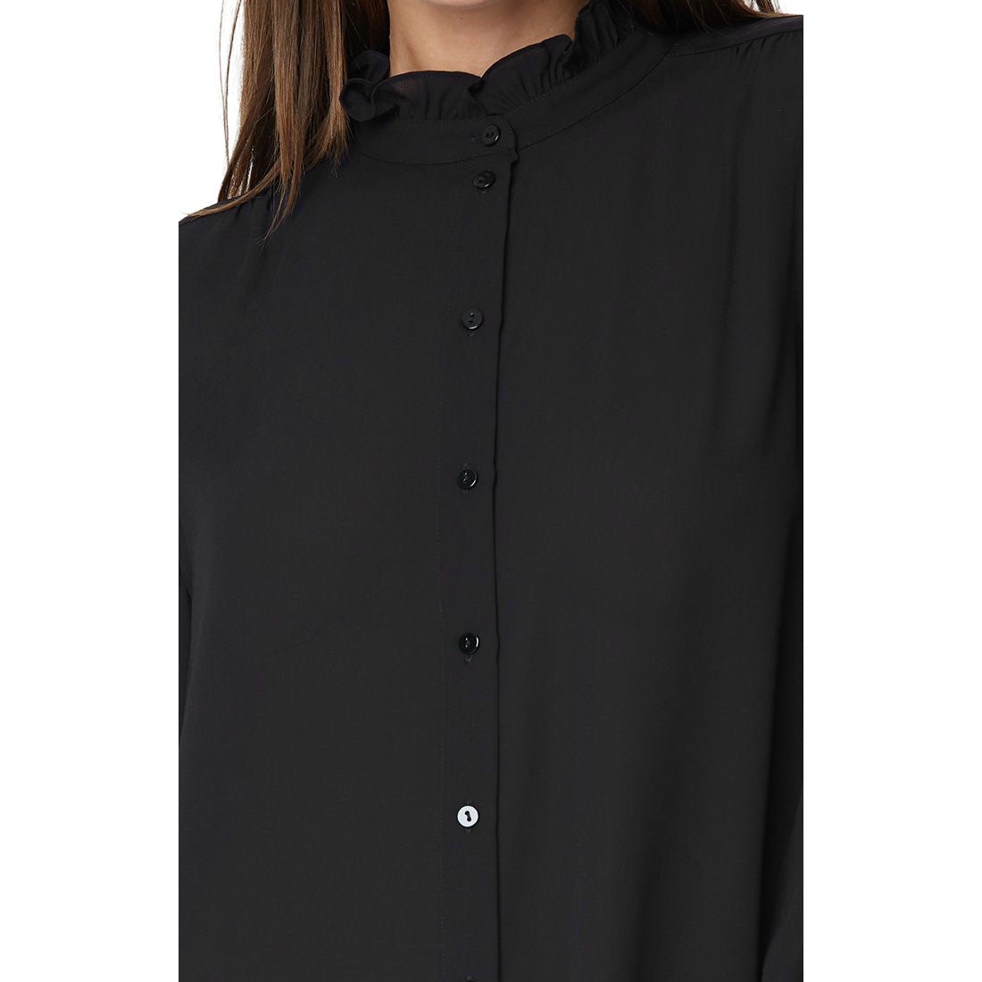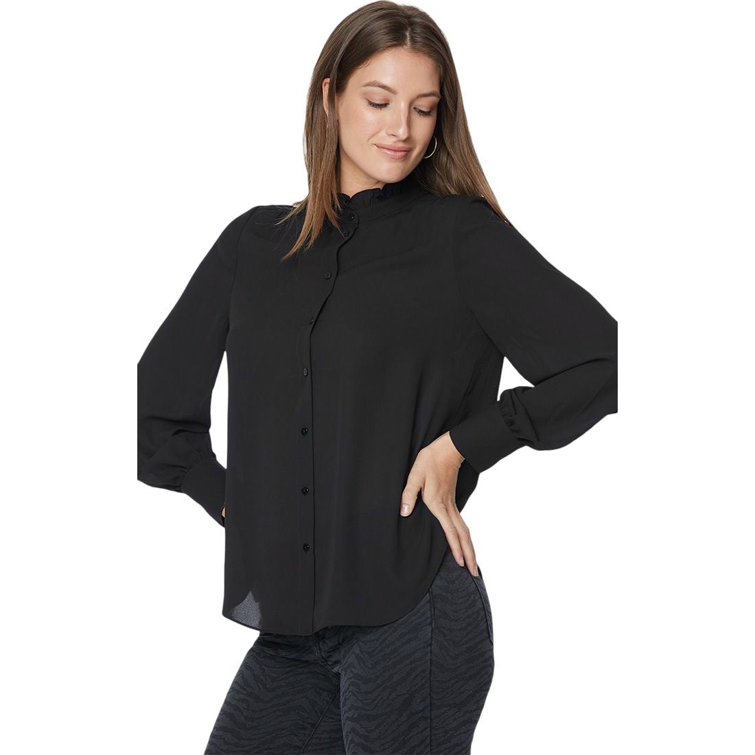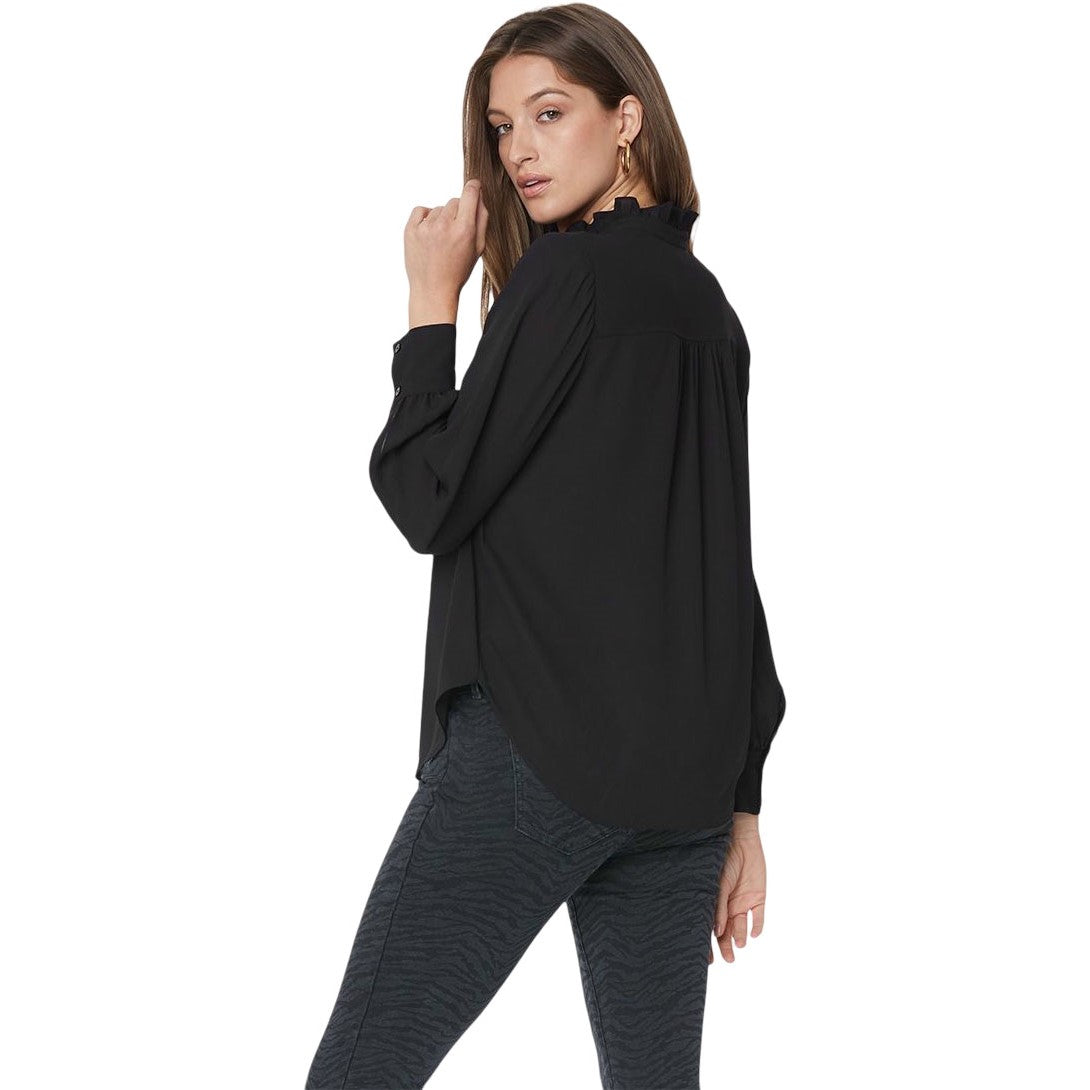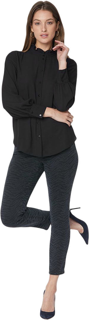 The Ruffle Neck Blouse by NYDJ makes any outfit more feminine with a ruffle-trimmed high collar and pintucked shoulders. This pretty style buttons up the front and has long sleeves. This blouse's fabric is made with a sustainable polyester fiber created from 100% post-consumer plastic waste, resulting in less water and energy use and fewer greenhouse gas emissions without changing the look and feel of the fabric. The buttons are made with 50% post-consumer recycled polyester.