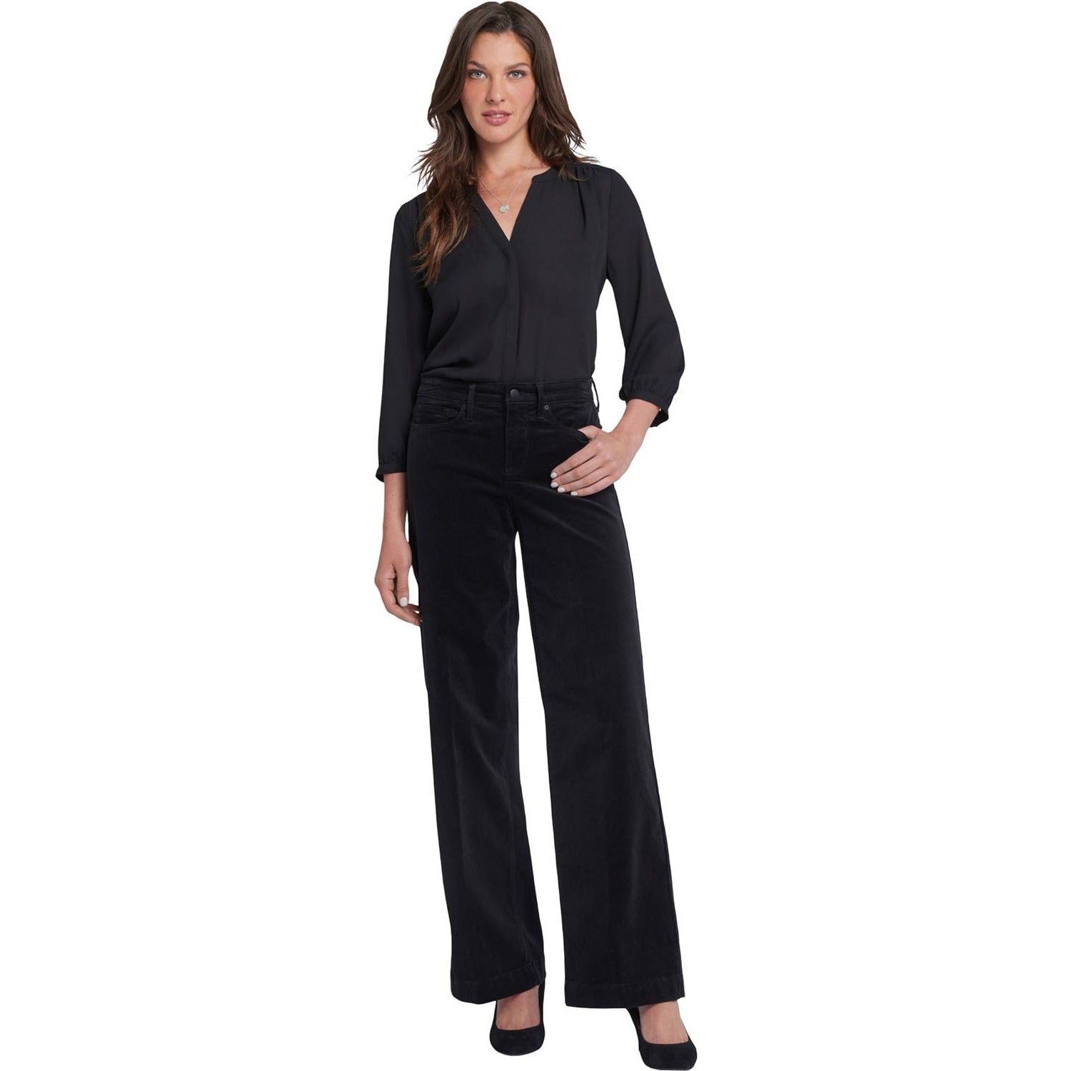 The Teresa Wide Leg Pants by NYDJ cinch your waist, enhancing your natural silhouette. Their wide legs add instant polish to everything you pair them with, and they're made from our fine wale stretch corduroy, which has a smaller texture and softer feel than typical corduroy. Our Lift Tuck Technology is made to help you keep your shape, with a proprietary slimming panel with a patented criss-cross design that smooths and sculpts. Features five-pocket styling, a zip fly with button closure and deep trouser-style hems. This pant is made with earth-friendly methods that result in reduced consumption of water, chemicals and/or energy.