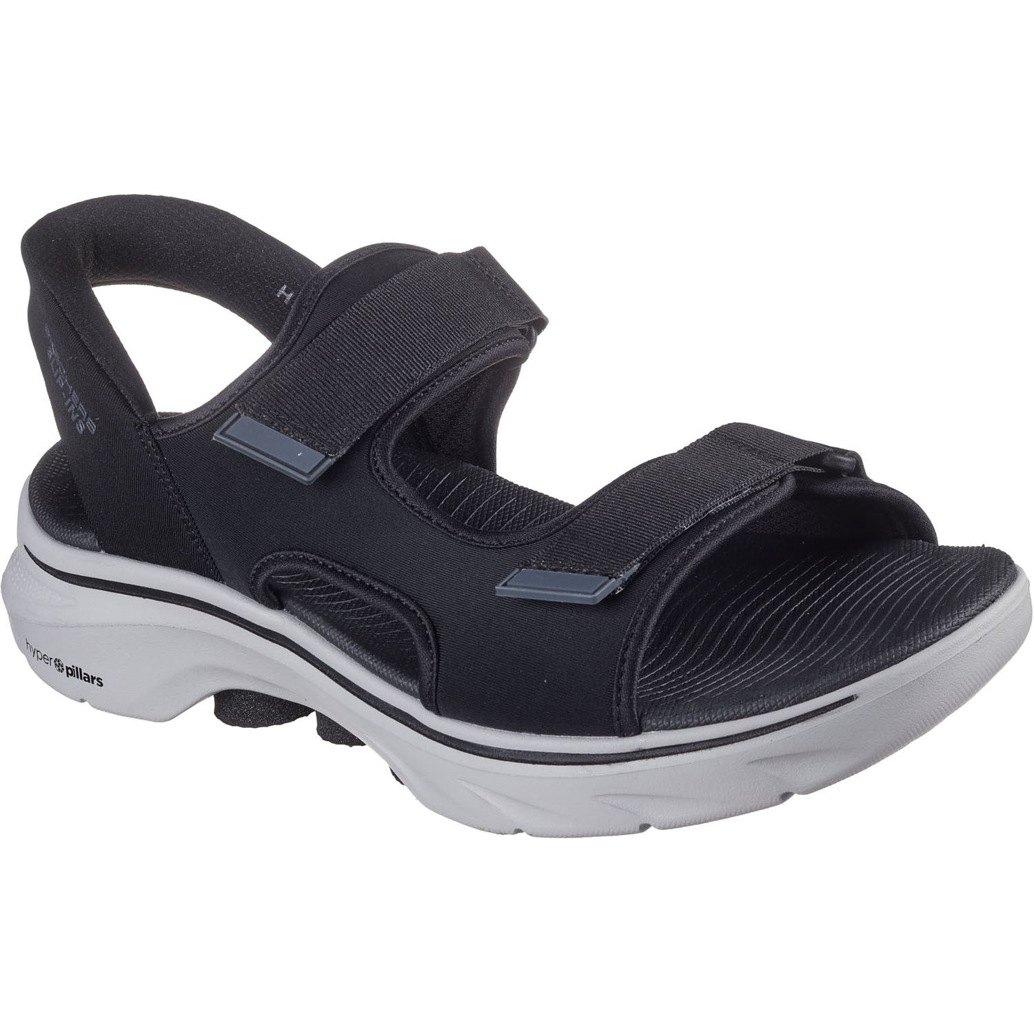 Experience an effortless way to wear your favorite sport sandal with Skechers Hands Free Slip-ins: GO WALK 7 Sandal - Ken. Designed with our Heel Pillow, this strap sandal features a woven fabric and synthetic upper with adjustable straps, Skechers Hands Free Slip-ins back heel, contoured Goga Mat footbed, lightweight ULTRA GO cushioning, and high-rebound Hyper Pillar Technology for added support.